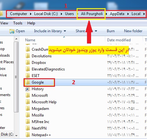 سپس به مسیر زیر بروید و فولدر گوگل را پاک کنید. (لطفاً دقت کنید که مسیر این مرحله با مرحله ششم متفاوت است)