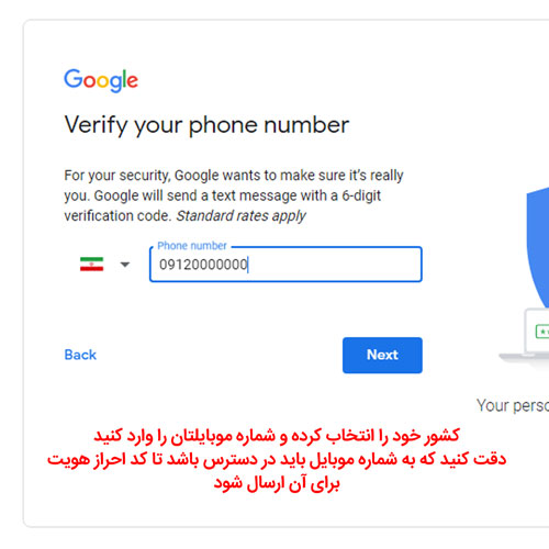 5. حالا باید با یک شماره تلفن حساب خود را تایید کنید. به منظور افزایش امنیت، Google از احراز هویت دو مرحله ای استفاده می کند. روی دکمه Next کلیک کنید.