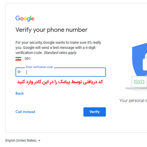 6. کد ارسالی برای شماره موبایل را وارد کنید. از نکات مهمی که در آموزش ساخت جیمیل باید به آن اشاره کنیم فرآیند تایید دو مرحله ای است. این فرآیند به منظور امنیت هرچه بیشتر حساب کاربری شما اجرا می شود. در این روش احراز هویت، شما برای ورود به جیمیل از طریق کامپیوتر، باید یک کد را بر روی صفحه ی گوشی خود تایید کنید؛ با این روش کار هکرها برای دسترسی به حساب شما تا حد بسیار زیادی سخت خواهد شد.